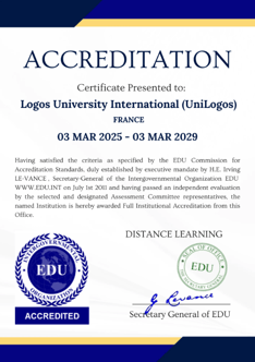 • Órgão de Acreditação e Aprovação Estadual: A UniLogos é credenciada pela EDU – uma IGO fundada pelo Ministério da Educação de Palau. Essa acreditação é oficialmente reconhecida pelo governo de Palau, conferindo aprovação estadual às operações e aos diplomas da UniLogos.