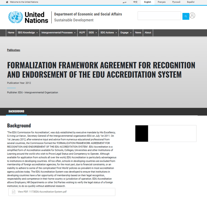 Em resumo, o papel da EDU.int é o de uma autoridade de acreditação reconhecida globalmente, apoiada pelo Ministério da Educação de Palau e reconhecida pela UNESCO. Isso lhe dá uma posição legal comparável a outros órgãos educacionais baseados em tratados e garante validade aos credenciamentos que concede.